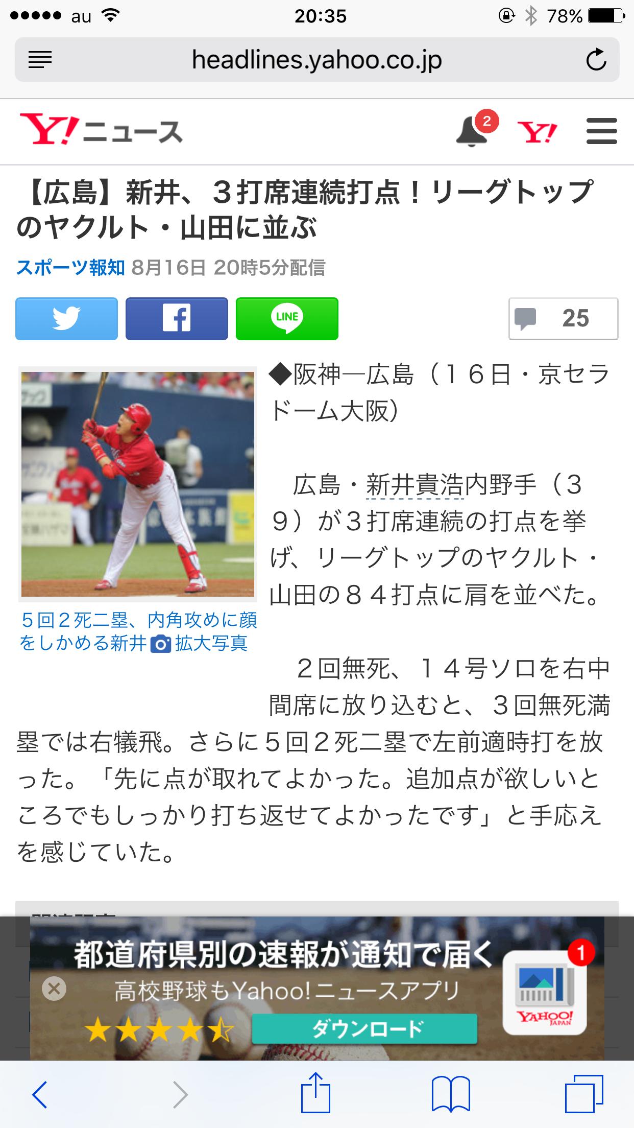 広島新井←打球直撃も骨に異常無し  ヤクルト雄平←ファウルを打って右手首負傷